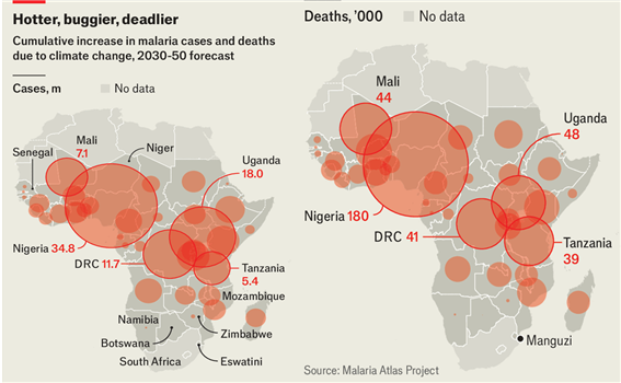 사진은 2030~2050년에 기후변화로 인해 추가적으로 발생할 말라리아 환자 수. /국제보건애드보커시